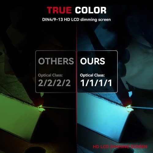 【SUPERIOR CLARITY】The welding helmet features top 1/1/1/1 optical clarity lens with advanced true-color technology and large viewing screen 3.86”×1.69”, it will vastly improve your vision experience then you can work efficiently and with precision.