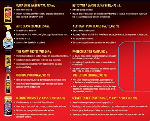 Includes: Armor All Tire Foam Protectant, Armor All Ultra Shine Wash and Wax, Armor All Original Protectant, Armor All Cleaning Wipes, Armor All Auto Glass Cleaner