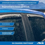 Air it out in style and adventure on with the AVS In-Channel Ventvisor. It installs inside the window channel for a seamless look and gives you total control over the climate of your cab. Invented, engineered and made in the USA with global materials to custom fit your vehicle’s exact year, make, and model, this in- channel mounted side window deflector keeps rain and weather out and fresh air in. The constant circulation of air sweeps away unwanted odors from pets, smoking, spills and more. This sleek In-Channel Ventvisor comes in a dark smoke finish with UV resistant materials so no matter how many hours you spend behind the wheel, the color never fades from exposure to the sun. Installation is hassle-free with no drilling or special hardware required – just attach with the included 3M automotive grade adhesive from the comfort of your own home. All AVS side window deflectors are engineered tough to withstand all the elements and are backed by a Limited Lifetime Warranty.