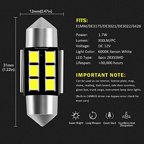 ▼Super bright and CANBUS error free: comes with 6 pieces 2835 LED chips for maximum light output, 300% brighter than halogen bulb. Built-in CANBUS driver can bypass error check for most cars (error free may not be compatible to the newest European vehicle and Mercedes Benz etc).