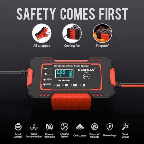 【HIGH-EFFICIENCY PULSE REPAIR】battery charger automotive detects battery sulfation and acid stratification, take newest pulse repair function to restore lost battery performance for stronger engine starts and extended battery life. NOTE: can not activate or charging totally dead batteries.