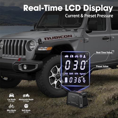 LARGE LCD DUAL DISPLAY – Our portable tire inflator features a dual digital LED display that shows real-time and preset pressure values, product status, and possible errors. The advanced chip ensures accurate pressure control and monitoring for safe inflation. Say goodbye to guesswork with our user-friendly 12v air compressor. (Please ensure that the preset pressure is higher than your tire’s current pressure).
