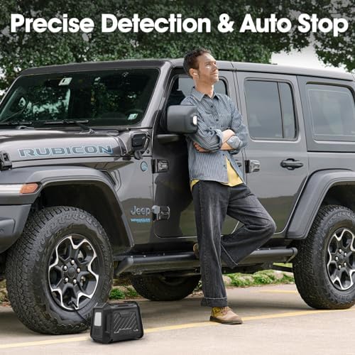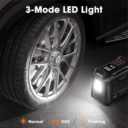 EASY OPERATION & LED LIGHT – Just three simple steps – connect, preset, and start. Our digital tire inflator also features a memory function for easy one-key use next time. The air pump for car tires has 3 lighting modes (Flash Bright, SOS, and Blinking mode), making it suitable for roadside emergencies and nighttime use. The SOS mode emits a red flash to alert passing vehicles for enhanced safety.