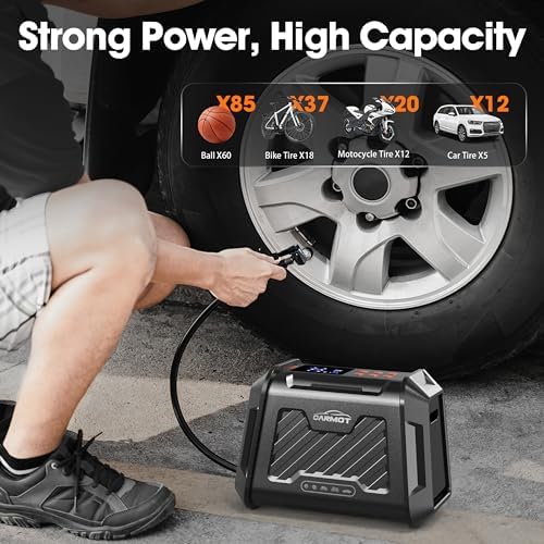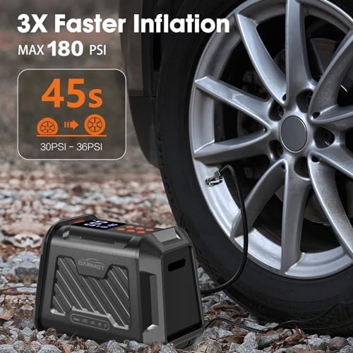3X FASTER INFLATION & AUTO SHUT-OFF – With a maximum pressure of 180 PSI and an airflow of 50L/Min, our portable air pump can quickly inflate a 195/55/R15 car tire from 0 to 35psi in under 5 minutes. Set your desired pressure and the air pump for car will automatically shut off once reached, ensuring safe and reliable operation. Please NOTE that after 15 minutes of continuous use, allow the car air pump to rest and cool for an equal amount of time before continuing.