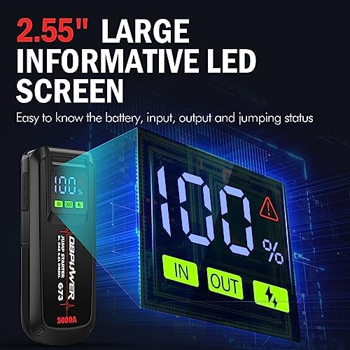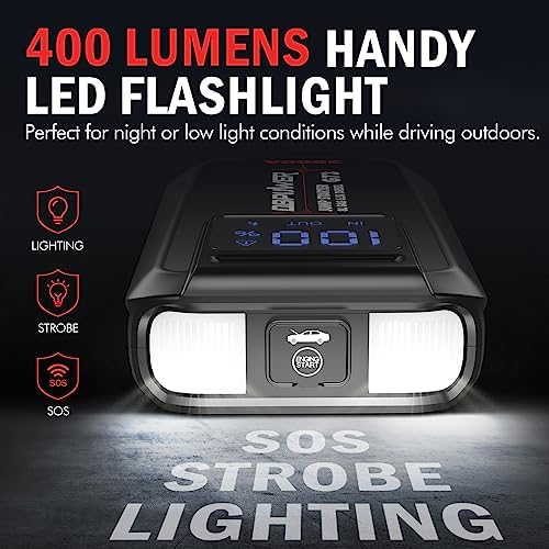 2.55” INCHES LARGE LCD SCREEN: this car jump starter is packed with a 2.55 inches intuitive LCD screen which helps you to know the remaining battery, charging status, and error signals precisely at a glance, rather than looking at the battery bar lights and guessing the exact remaining power. A bright LED light is added on the top of this jump starter to make it work as a flashlight to assist you at night or in poor light conditions.