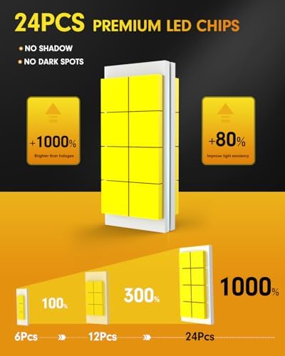 【1000%Brighter than Halogens】Upgrade Your Driving Visibility–Newest H11 9005 Light Bulbs Combo! Experience 1000% brighter light than standard halogen bulbs, thanks to advanced 24-chip CSP (Chip-Scale Package) technology. These high-performance Light bulbs produce a powerful 100,000LM output with a 6500K cool white beam, ensuring clearer, wider, and longer-range illumination for nighttime driving, foggy conditions, and heavy rain.