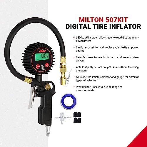 Pistol Grip Body Design: Molded out of high quality steel into a comfortable, ergonomic design with a fully integrated deflate button for easy and quick tire pressure tune-up and 14″ rubber hose with easy-clip air chuck for easy, one-handed inflation