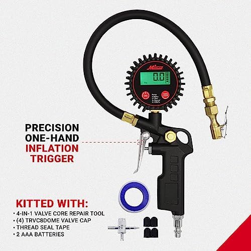 LCD Digital Pressure Gauge: Backlit display perfect for low light applications; auto-on when tire pressure is detected; auto-off after 15 seconds of inactivity to save battery life (2 AAA batteries required)