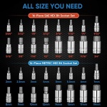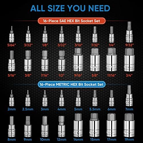 [32PCS COMBO SET] 16pcs Metric bits include 1/4″ Drive: 2mm, 2.5mm, 3mm, 4mm, 5mm, 5.5mm, 6mm, 3/8″ Drive: 7mm, 8mm, 9mm, 10mm, 12mm, 1/2″ Drive: 14mm, 15mm, 17mm, 19mm. 16pcs SAE bits Include 1/4″ Drive: 5/64″, 3/32″, 1/8″, 5/32″, 3/16″, 7/32″, 1/4″, 3/8″ Drive: 9/32″, 5/16″, 3/8″, 7/16″, 1/2″, 1/2″ Drive: 9/16″, 5/8″, 11/16″, 3/4″. 32 pcs set are packed with both metric and SAE bits.