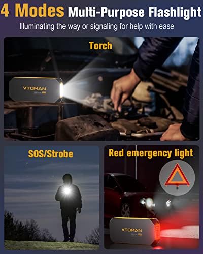 【Portable Laptop Charger with 100W AC Socket】VTOMAN V12 jump starter is also a portable laptop power bank with a 100W AC Outlet which powers your laptop and other small appliances. And another USB-A QC3.0 and USB-A(5V/2.1A) output ports will fully charge your cellphones and other mobile devices at the 3 times speed faster than others. The 15V/10A DC port that can power for other car products as tire inflators, vacuum, etc. The PD 18W Type-C fast Input port will make your trip full of power!